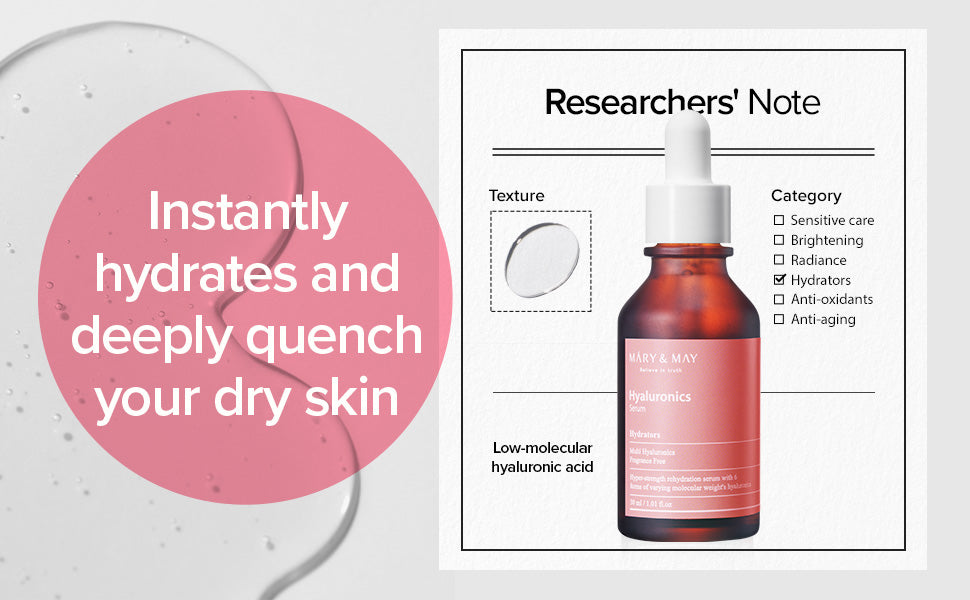 A serum formulated with small molecular structure of hyaluronic acid that penetrates the skin between skin cells and moisturize from within.