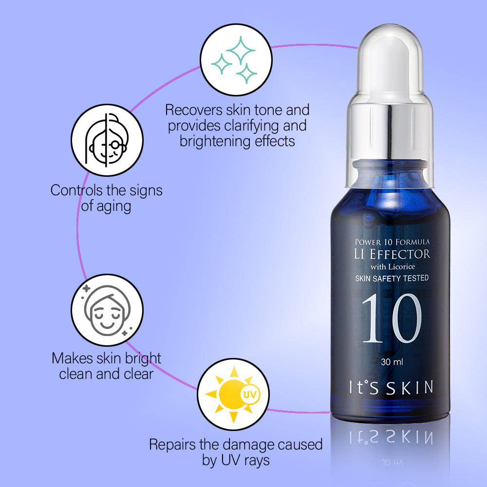 Enriched with Licorice extracts and Vitamin E, It's Skin Power 10 Formula LI Effector recovers skin tone by brightening skin and reducing dullness. It corrects uneven skin tone by reducing the redness and dark spots. It has a soothing and rejuvenating effect on the skin.