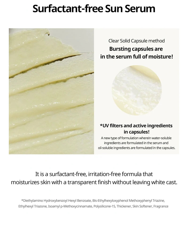 Moisture-filled blemish care serum wraps around a capsule containing UV filters and effective ingredients, creating a new concept of moisture sun serum that gives your skin a moist feeling without worrying about white casts.