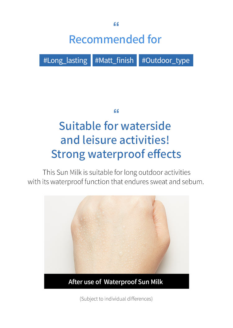 This Sun Milk is suitable for long outdoor activities with its waterproof function that endures sweat and sebum. Its light finish hydrates the skin, leaving it refreshed and soothed.
