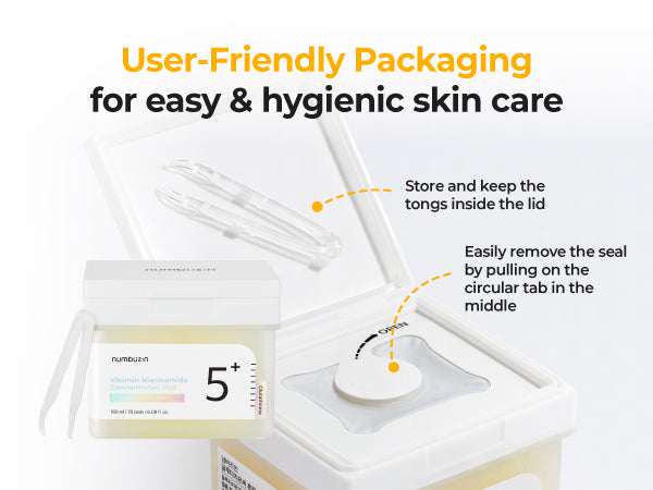 Numbuzin No.5 Vitamin-Niacinamide Concentrated Pad helps to improve skin tone, reduce the appearance of dark spots, and protect the skin barrier.