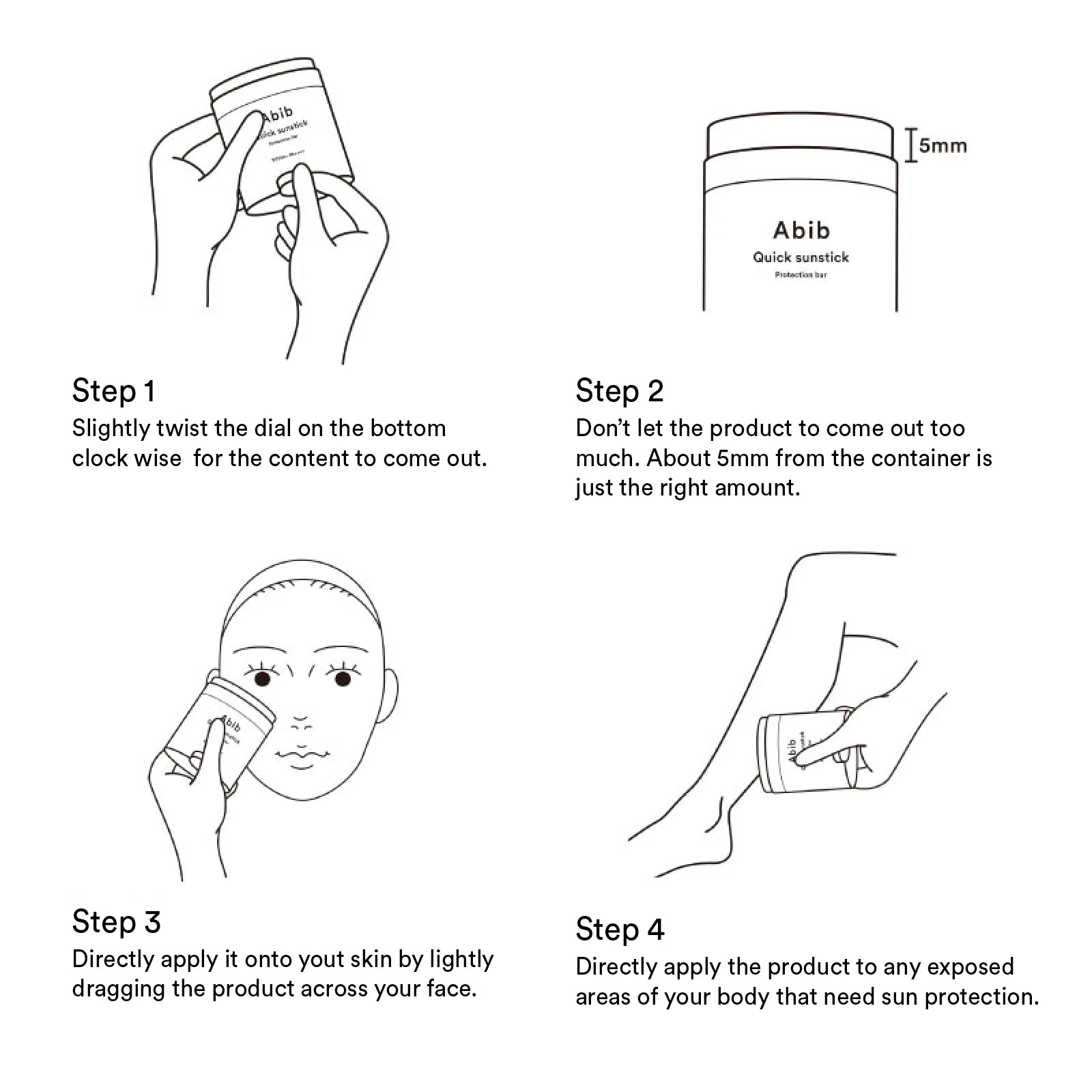 Directions: Roll out some substick with the dial at the bottom of the container. Directly apply onto skin that will be exposed to the sun, including face and body.