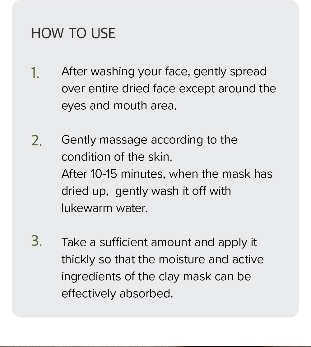 The creamy soft clay mask containing moisture is thoroughly applied along curves of skin to effectively deliver moisture and nutrition inside the skin.
