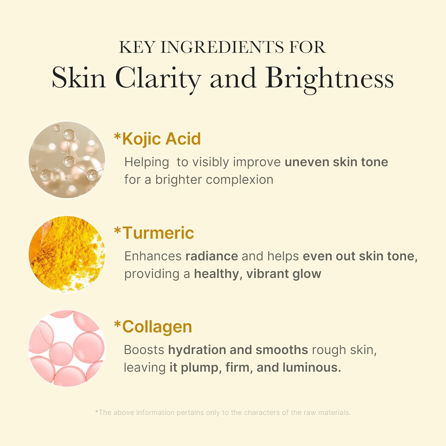 Purified Water, Polyvinyl Alcohol, Glycerin, Butylene Glycol, Niacinamide, 1,2-Hexanediol, Sodium Hyaluronate, Isopentyldiol, Turmeric Root Extract (5,000 Ppm), Polyglyceryl-10 Laurate, Propanediol, Glyceryl Glucoside, Ethylhexylglycerin, Xanthan Gum, Adenosine, Disodium EDTA, Glucose, Kojic Acid (1.0989 Ppm), Ascorbic Acid, Soybean Oil, Collagen Extract, Retinol