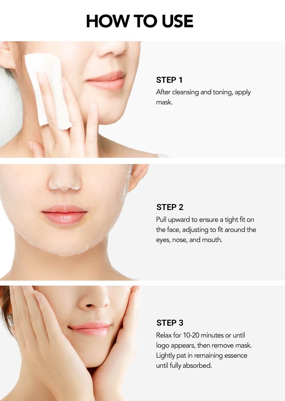 Directions: 1) After cleansing and toning, apply mask. 2) Hold lifting line and pull upward to fit mask tightly to face, adjusting to fit around eyes, nose, and mouth. 3) Relax for 10-20 minutes, then remove mask. Lightly pat remaining essence to help it absorb into skin.