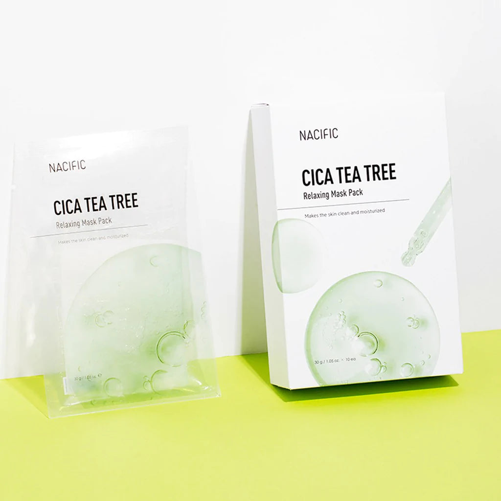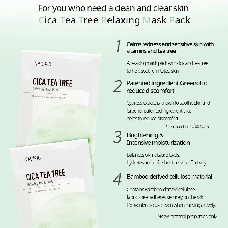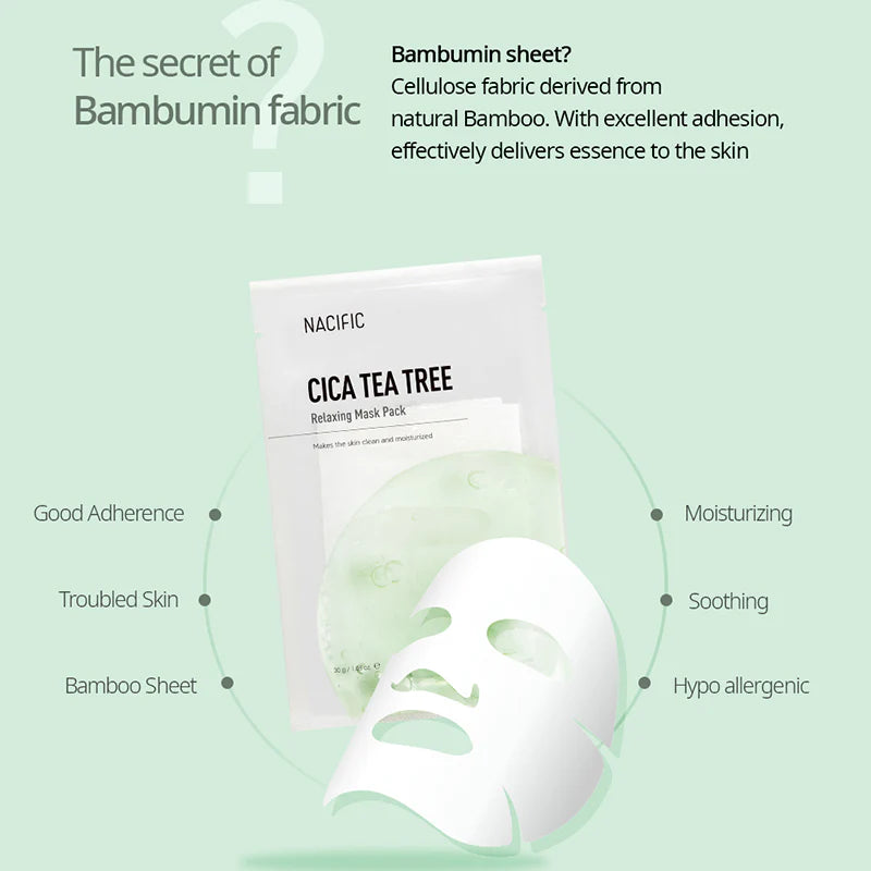 Nacific Cica Tea Tree Mask is a sheet mask with excellent adhesion that contains Centella Asiatica and Tea Tree extracts to soothe irritated skin, heal troubled skin, and regulate the excessive sebum.